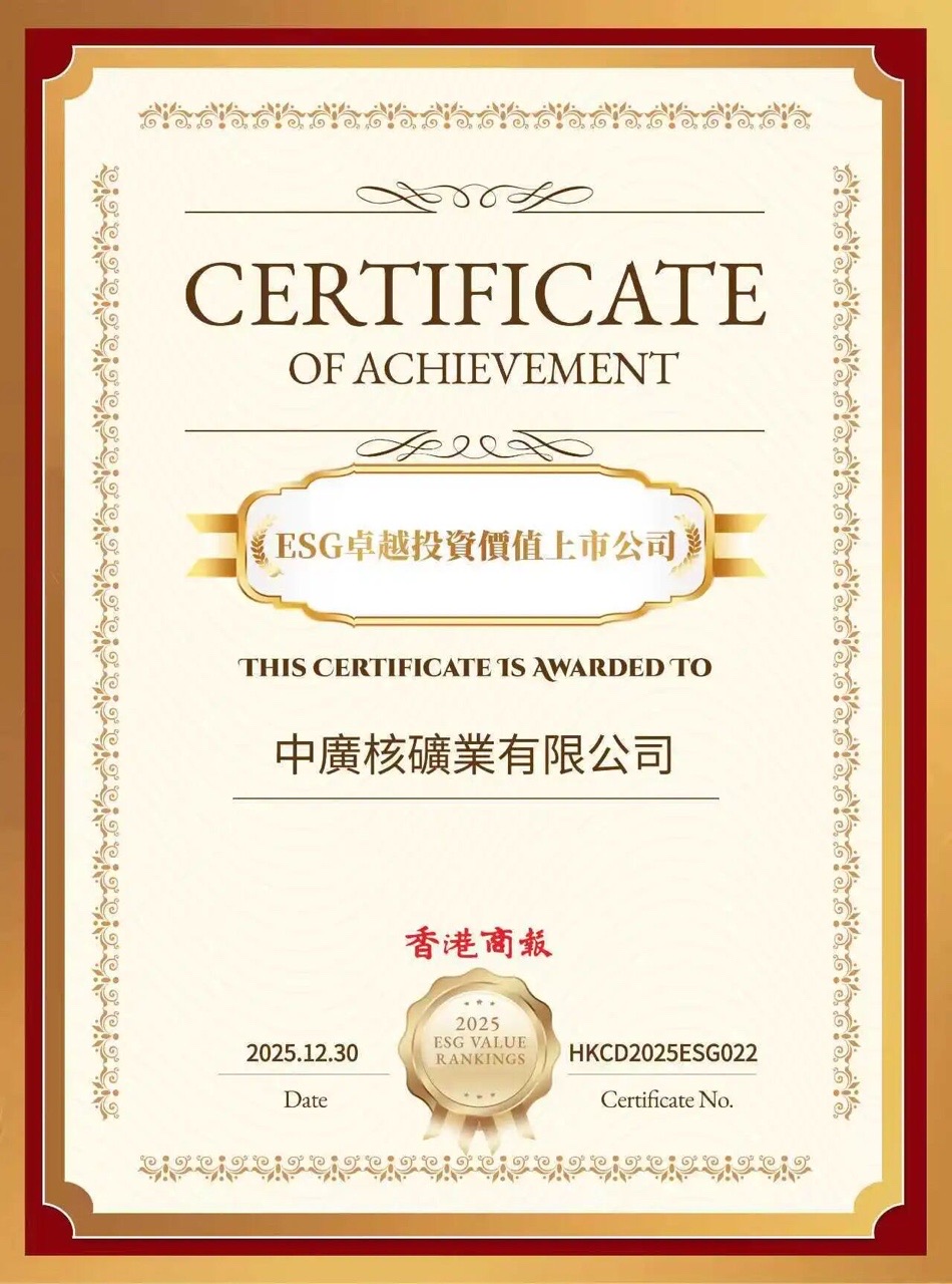 日前,由《香港商報(bào)》主辦的“2025年度上市公司卓越ESG價(jià)值榜”頒獎(jiǎng)典禮在香港灣仔隆重舉行。中廣核礦業(yè)憑借在環(huán)境、社會(huì)與管治(ESG)領(lǐng)域的優(yōu)異表現(xiàn),獲評(píng)“ESG卓越投資價(jià)值上市公司”。本屆評(píng)選由《香港商報(bào)》聯(lián)合專業(yè)機(jī)構(gòu)發(fā)起,旨在挖掘港股市場(chǎng)中積極履行社會(huì)責(zé)任、具備長(zhǎng)期增長(zhǎng)潛力的標(biāo)桿企業(yè)。香港特區(qū)政府、金融監(jiān)管機(jī)構(gòu)、資本市場(chǎng)專家及相關(guān)行業(yè)代表出席活動(dòng),為獲獎(jiǎng)企業(yè)頒發(fā)證書。此次獲評(píng)“ESG卓越投資價(jià)值上市公司”獎(jiǎng)項(xiàng),不僅是權(quán)威媒體對(duì)中廣核礦業(yè)ESG治理水平的認(rèn)可,更是對(duì)其投關(guān)價(jià)值與ESG實(shí)踐深度融合的肯定。